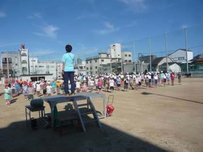 今朝は、運動会の開・閉会式の隊形で行いました。