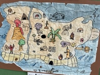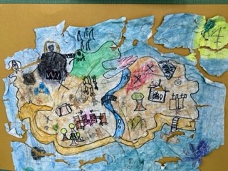 4年の図工「宝島」の作品です。色のかすれ、ちょっとしわをつけて、穴もあけてなど、本物の「宝の地図」みたいですね。