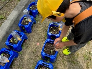 1年生は、自分のプランターで「あさがお」を育てています。毎日水やりを日課にしています。芽が出てきて子どもたちは大喜び。この日も放課後、変える間際に、自分の「あさがお」に水をあげていました。