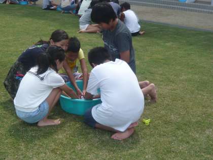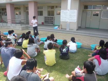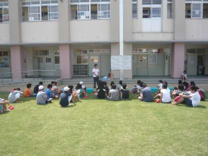 芝生の上で、6年生家庭科の授業です。