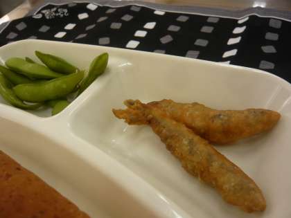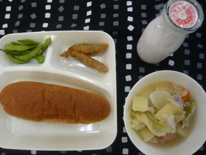 献立は、いわしのてんぷら、じゃがいものスープ煮、枝豆、パン、牛乳でした。