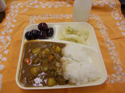 米粉を使った ビーフカレーライス、キャベツのサラダ、デザートは巨峰のぶどうでした。 おいしく大好きなカレーライス!みんな楽しく完食しました。ごちそうさまでした!!