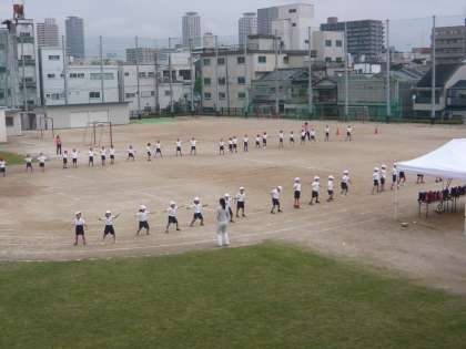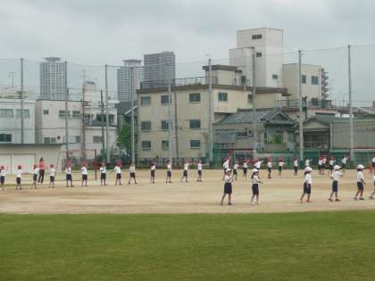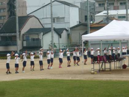 朝方、雨があがっているときに1・2年生が運動場に出て団体演技の練習をしていました。