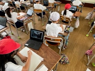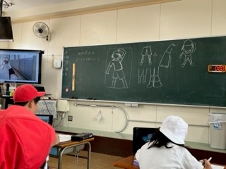 運動会で頑張った自分の姿を絵にします。どんなポーズがいいか考えました。決めたポーズを写真に撮り、それを見ながら下絵を描いていました。