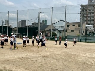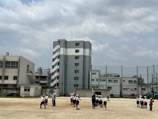 今日の1年生の体育は、玉入れの玉を使って、その玉を遠くに投げていました。しなやかに腕を振り、遠くまで投げているお友だちもいましたよ。