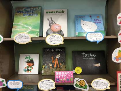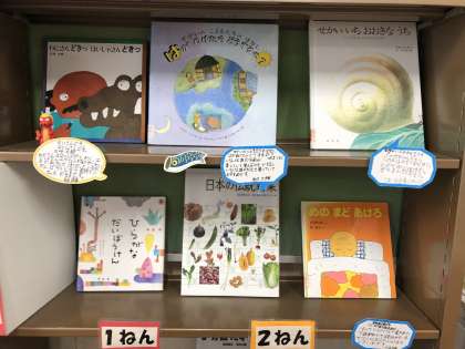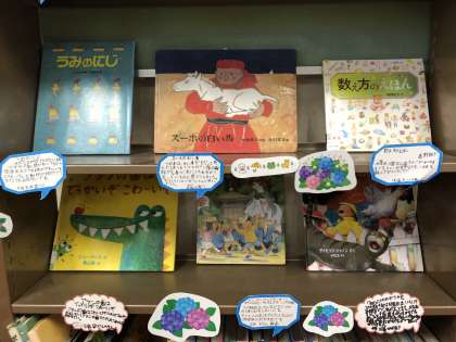 図書委員会からのお知らせです。今月のおすすめ図書を図書館で紹介しています。児童の皆さん、図書館に来たらぜひ紹介コーナーに注目してくださいね。