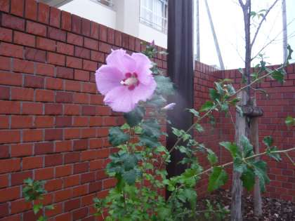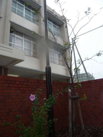 正門脇の植え込みにソメイヨシノとムクゲの樹を植えています。