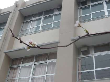 ふと見上げると、ソメイヨシノの枝に花が咲いていました。