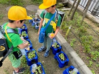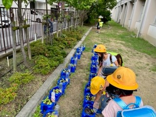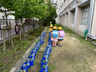 1年生の日課です。朝登校してきたとき、自分たちが育てているアサガオに、水をあげています。