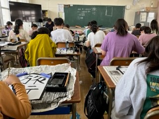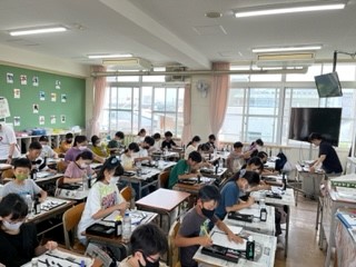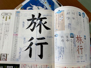 6年の習字の時間です。今日は「旅行」というお題にチャレンジしました。「はらい」や「はね」から次の画に向かう動きに注目して書きました。