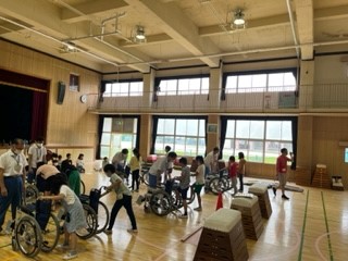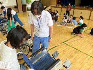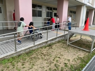 4年生の車いす体験の学習の様子です。リハビリテーションセンターのスタッフの方々に、安心して、車いすを利用できる環境の話や、車いすの使い方、車いすを利用されている方々の気持ちなど、とても大切な事を教えていただきました。