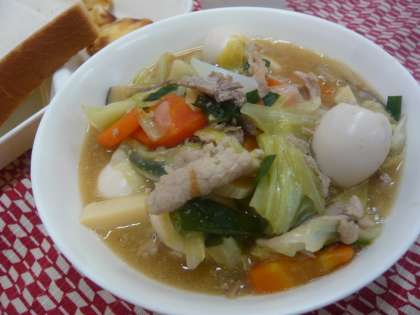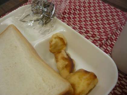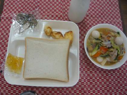 献立は、豚肉の中華煮、さつまいものてんぷら、ミニフィッシュ、パン、ジャム、牛乳でした。