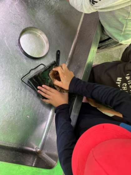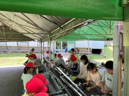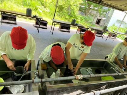 食べた後は、みんなで後片付け、洗い物です。よく磨けたかの厳しいチェックがこの後待っています。