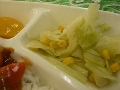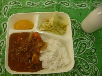 献立は、ハヤシライス、野菜サラダ、黄桃(缶)、牛乳でした。
