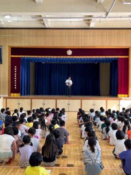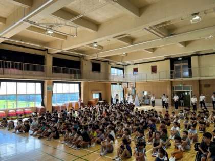 長い夏休みが終わり、今日から2学期がスタートしました。登校時、いつもと変わらず、元気なあいさつができていて、安心しました。きっと、充実した夏休みを送れたのでしょう。久しぶりの講堂での始業式でも、すばらしい態度で、集中して取り組む子どもたちを見て、心引き締まる思いを持ちました。保護者、地域の皆様、2学期もどうぞよろしくお願い致します。