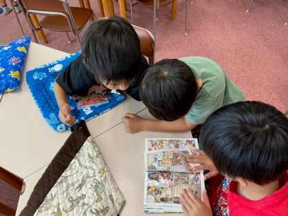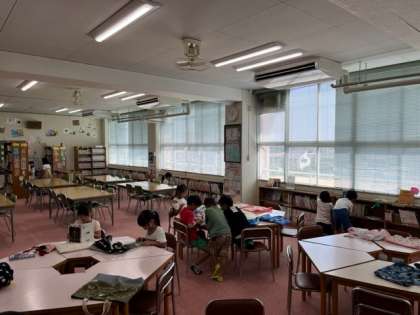 1年生の図書の時間。広い図書室で、好きな本を選びます。気に入った本が見つかれば、みんなと仲良く読書をします。