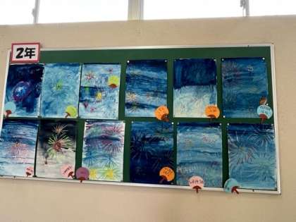 2年の図工の作品掲示、「花火」です。夏の夜空を彩ります。