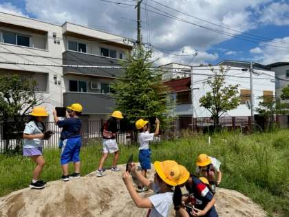 1年の生活科の学習の様子です。学習園でいきものをさがしました。写真や動画をとり、大はしゃぎでした。