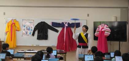 ソンセンニㇺから、韓国・朝鮮の文化について教えていただきました。2年生のテーマは「色」と「民族衣装」でした。日本の着物との違いや、色の意味などを知り、工作しながら楽しく学ぶことができました。