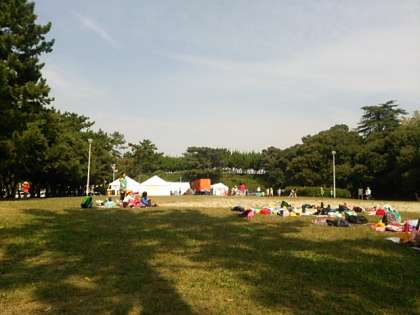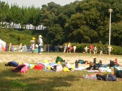 お弁当の後は、広場いっぱいに広がって各班ごとに影踏みオニゴッコをしています。