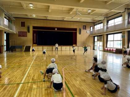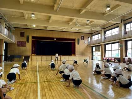 1年生の体育の様子です。講堂で、いきものに変身して走ります。みんな楽しそう!