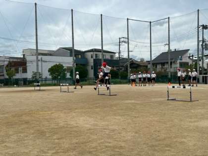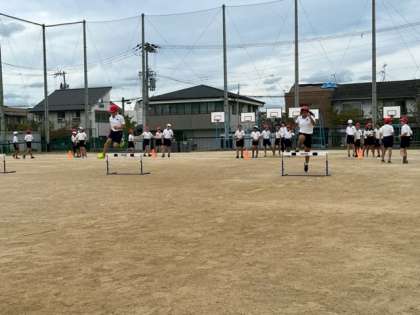 「ハードル走」の学習の2時間目。前回、日本を代表するハードラーの動画を見て、ハードルを跳び越すときのポイントをイメージしました。今日は、そのイメージを思い出し、練習に取り組みました。