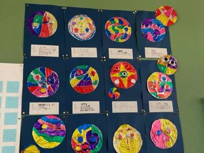 5年の図工、「太陽の顔」ができあがりました。個性あふれる作品の数々です。