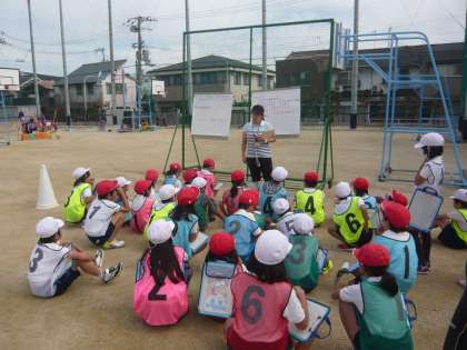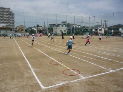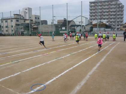 体育の授業で「小型のハードル」を走る学習の始まりです。きょうは、輪を置いて飛び越す練習をしました。歩数を数えて大股で走るのにも挑戦しました。