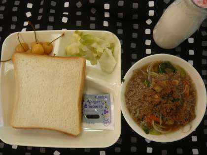 キャベツも食べて、お野菜たっぷり、デザートのさくらんぼは 一人5個ずついただきました。 とってもおいし給食でした!!