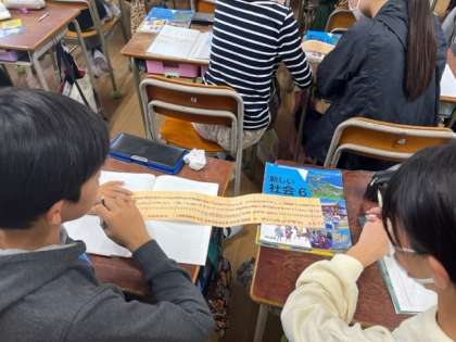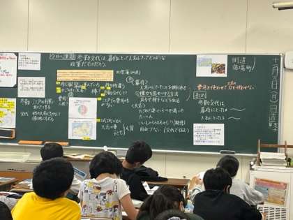 6年社会、歴史学習の一コマ。今日は、江戸幕府の「参勤交代は、幕府と大名にとってどのような政策だったのか?」を幕府と大名の立場で調べていき、意見を交流しました。