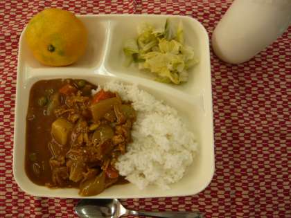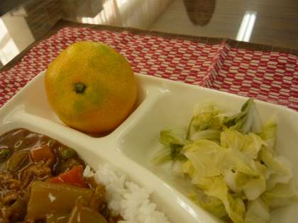 献立は、ポークカレーライス(米粉)、はくさいのピクルス、みかん、牛乳でした。