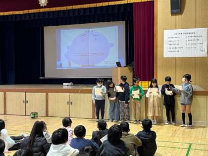 本日、学校歯科医の先生、PTA保護者の方々を招き、学校保健委員会を実施しました。今年のテーマは、「歯の健康は体全体の健康へ」でした。各委員会からの「歯の健康」についての発表は、工夫をこらしていてみんなで楽しく学べました。また、学校歯科医の先生のお話は、「歯周病」についてのお話でした。とても充実した取組となりました。
