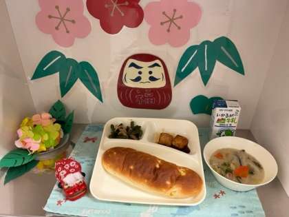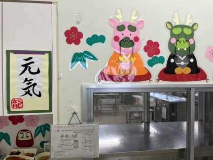 お正月の掲示です。調理員さん、いつもありがとうございます。3学期もよろしくお願いします。