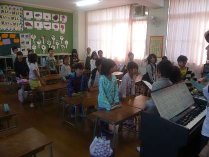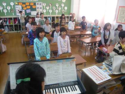 ノビノビたいそうも終わった2年生の教室では、朝の歌を歌っていました。