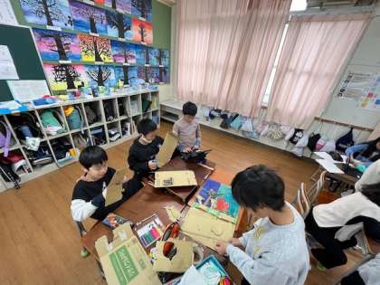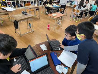 3年の学習の様子です。学習参観で活動する準備をしています。興味のあるテーマごとに、発表の準備をしています。みんな真剣です。
