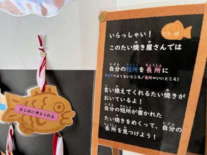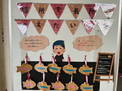 保健室前の掲示板です。今回は、「短所を長所にかえるとき」です。自分では「短所」だと思っているところも、見方を変えれば「長所に早変わり」です。