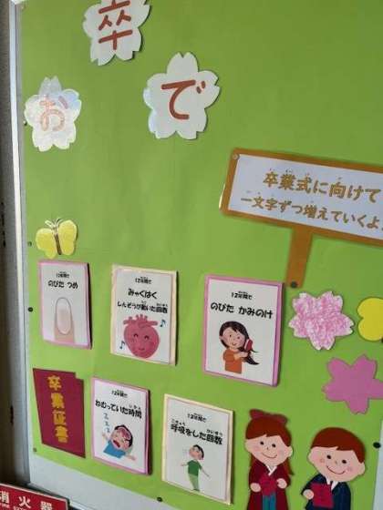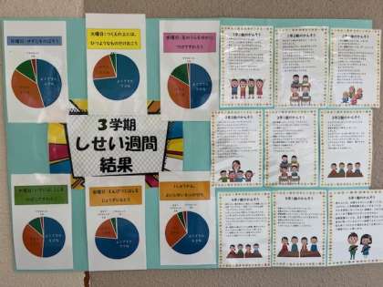 またまた保健室前の掲示物の紹介です。今回は、「姿勢名人大集合」、「姿勢週間結果」「卒○お○で○○」です。保健室前を通る際に、しっかり見てほしいです。