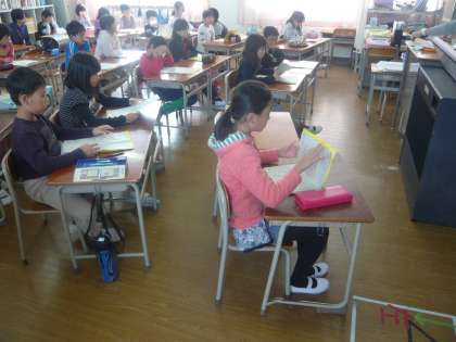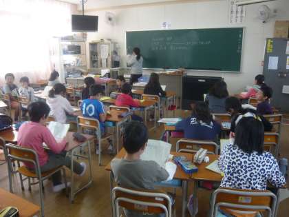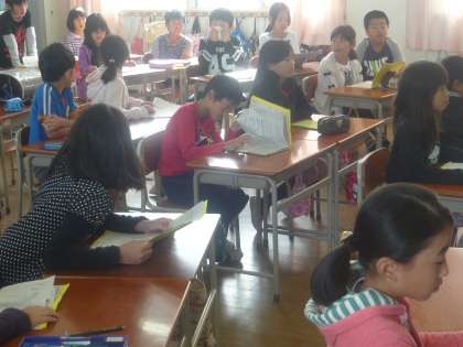 ドッジボール大会終了後、3年生は総合的な学習の時間の扱いで、学習発表会で発表する劇のセリフについて学習をしていました。