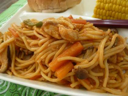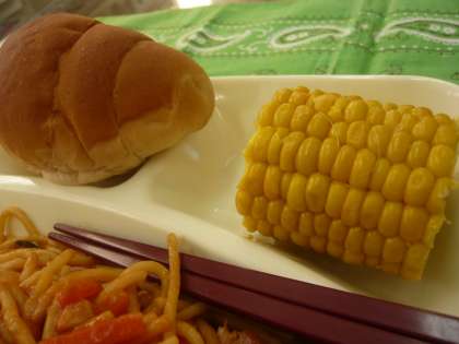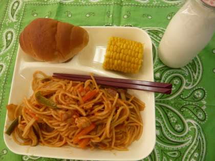 献立は、きのこのスパゲッティ、焼きとうもろこし、パン、牛乳でした。
