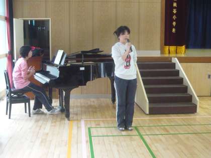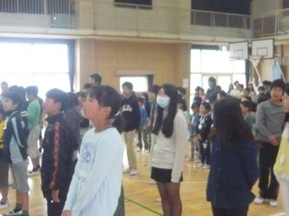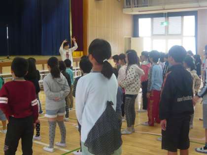 児童朝会、表彰と続いて最後に明日の東桃谷小学校創立85周年を祝って校歌を全員で斉唱しました。