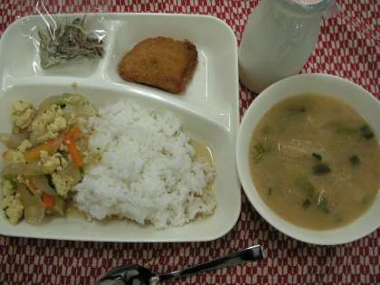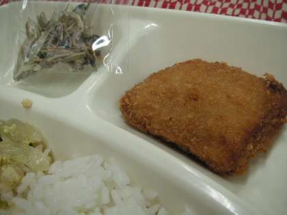 献立は、カツ丼、みそ汁、ミニフィッシュ、牛乳でした。