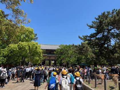 快晴の今日、高学年は奈良公園に遠足に行ってきました。集合写真を撮ったあと、さっそく奈良の大仏見学でした。その後は、班でオリエンテーリングでした。「二月堂」や「春日大社」をめぐるコースで、「飛火野」がゴールでした。広い「飛火野」でおいしいお弁当をいただきました。