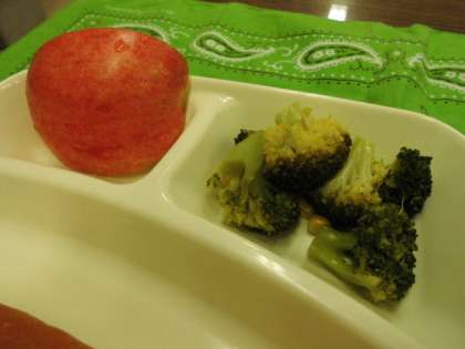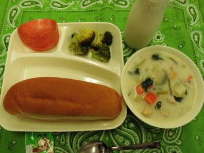 献立は、ほたて貝のクリームシチュー、ブロッコリーとコーンのサラダ、りんご、パン牛乳、マーガリンでした。
