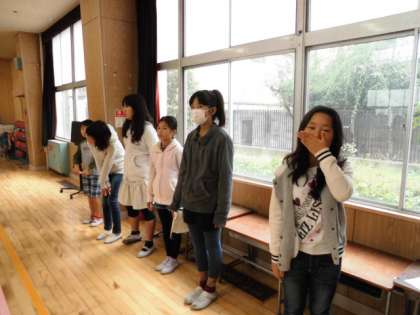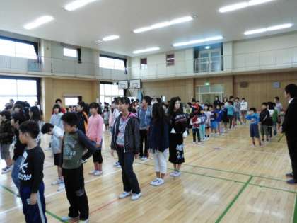 「好きな食事のタイプ(洋食か和食か)」「休日の過ごし方」「小学生のころの夢」の3つのヒントで縦割り班ごとに先生を予想し、各班の代表児童(6年生から順番に)がその先生のもとに集まるというようにして行いました。