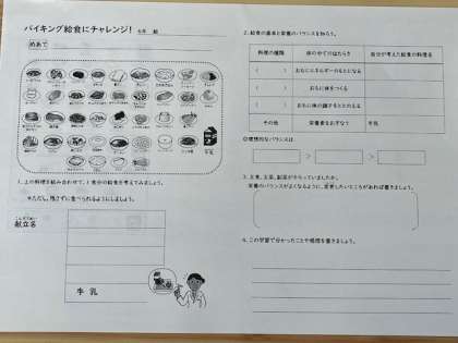 6年の栄養指導の様子です。栄養のバランスを考え、様々な料理を組み合わせていきます。主食、主菜、副菜がきちんとそろっているか確かめました。