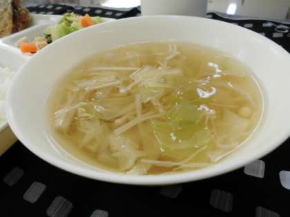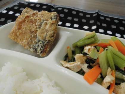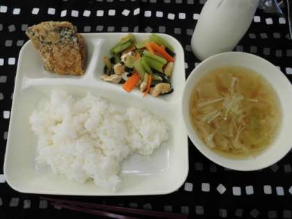 献立は、インド風さばのサクサクあげ、すまし汁、こまつなとあげの煮物、ごはん、牛乳でした。