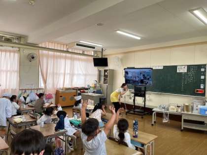 今日の給食の時間、生野区田島南小学校1年と、オンラインで給食交流を行いました。今日の給食の献立を紹介しあいました。これをきっかけに、交流を深めていきます。