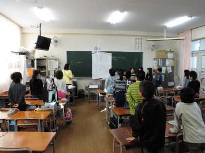 3年生では、ノビノビたいそう、健康・姿勢チェックに続いて朝の会が始まりました。