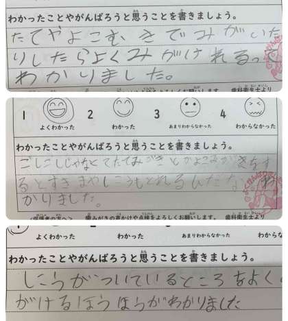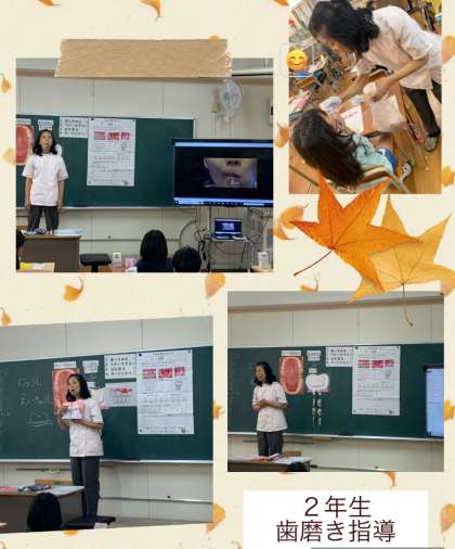 本日、学校歯科医の田中先生、教育委員会より歯科衛生士の松本先生にお越しいただき歯磨き指導を開催しました。実際に歯に歯垢が付着しているのがわかるように染め出しも行い、自分の歯の磨き残しがどこにあるのか目で見て分かったようです。赤く染まった歯はしっかり歯磨きをして子どもたちは「つるつるや〜!真っ赤っかやったのに白くなった!」と喜んでいました。縦磨きや横磨きしっかり使い分けて、歯の健康を守ろう!
