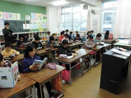 木曜日の朝、読書タイムに自分が選んできた本を静かに読んでいる4年生。